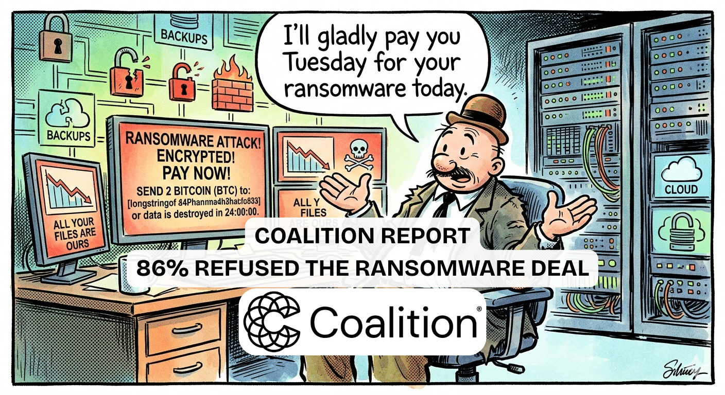 In the old Popeye cartoons, Wimpy liked to say, “I’ll gladly pay you Tuesday for a hamburger today.” When it comes to ransomware payment, companies seem to be stealing Wimpy’s line and saying, “I’ll gladly pay you Tuesday for your ransomware today.” And just like the cartoon, Tuesday, or “pay day,” never comes. Coalition’s new report on cyber insurance claims shows that 86% of ransomware victims refused to pay attackers in 2025, even as ransom demands soared.